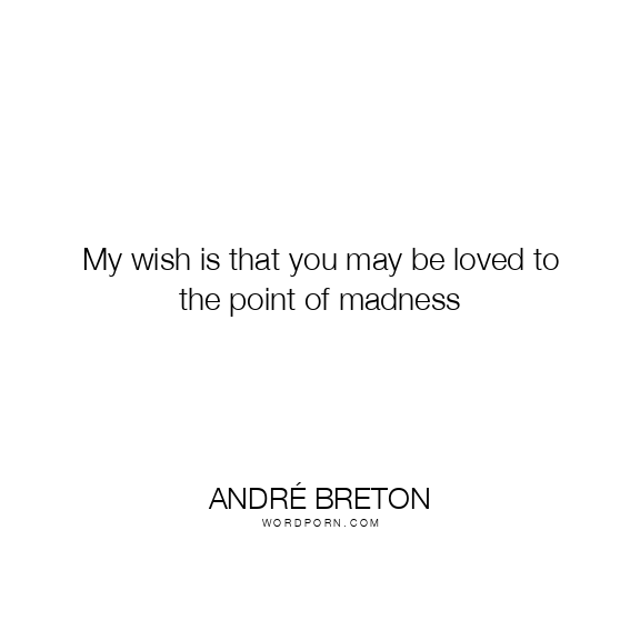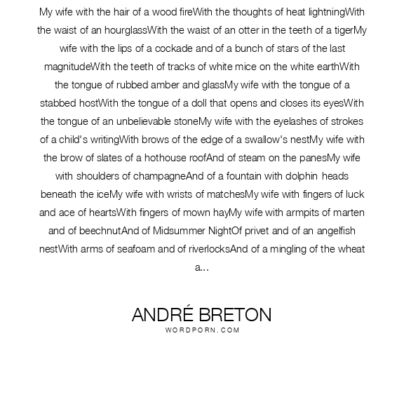 My wife with the hair of a wood fireWith the thoughts of heat lightningWith the waist of an hourglassWith the waist of an otter in the teeth of a tigerMy wife with the lips of a cockade and of a bunch of stars of the last magnitudeWith the teeth of tracks of white mice on the white earthWith the tongue of rubbed amber and glassMy wife with the tongue of a stabbed hostWith the tongue of a doll that opens and closes its eyesWith the tongue of an unbelievable stoneMy wife with the eyelashes of strokes of a child's writingWith brows of the edge of a swallow's nestMy wife with the brow of slates of a hothouse roofAnd of steam on the panesMy wife with shoulders of champagneAnd of a fountain with dolphin-heads beneath the iceMy wife with wrists of matchesMy wife with fingers of luck and ace of heartsWith fingers of mown hayMy wife with armpits of marten and of beechnutAnd of Midsummer NightOf privet and of an angelfish nestWith arms of seafoam and of riverlocksAnd of a mingling of the wheat and the millMy wife with legs of flaresWith the movements of clockwork and despairMy wife with calves of eldertree pithMy wife with feet of initialsWith feet of rings of keys and Java sparrows drinkingMy wife with a neck of unpearled barleyMy wife with a throat of the valley of goldOf a tryst in the very bed of the torrentWith breasts of nightMy wife with breasts of a marine molehillMy wife with breasts of the ruby's crucibleWith breasts of the rose's spectre beneath the dewMy wife with the belly of an unfolding of the fan of daysWith the belly of a gigantic clawMy wife with the back of a bird fleeing verticallyWith a back of quicksilverWith a back of lightWith a nape of rolled stone and wet chalkAnd of the drop of a glass where one has just been drinkingMy wife with hips of a skiffWith hips of a chandelier and of arrow-feathersAnd of shafts of white peacock plumesOf an insensible pendulumMy wife with buttocks of sandstone and asbestosMy wife with buttocks of swans' backsMy wife with buttocks of springWith the sex of an irisMy wife with the sex of a mining-placer and of a platypusMy wife with a sex of seaweed and ancient sweetmeatMy wife with a sex of mirrorMy wife with eyes full of tearsWith eyes of purple panoply and of a magnetic needleMy wife with savanna eyesMy wife with eyes of water to he drunk in prisonMy wife with eyes of wood always under the axeMy wife with eyes of water-level of level of air earth and fire