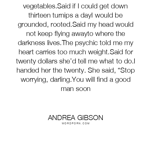 The nutritionist said I should eat root vegetables.Said if I could get down thirteen turnips a dayI would be grounded, rooted.Said my head would not keep flying awayto where the darkness lives.The psychic told me my heart carries too much weight.Said for twenty dollars she’d tell me what to do.I handed her the twenty. She said, “Stop worrying, darling.You will find a good man soon