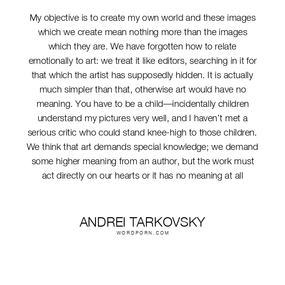 My objective is to create my own world and these images which we create mean nothing more than the images which they are. We have forgotten how to relate emotionally to art: we treat it like editors, searching in it for that which the artist has supposedly hidden. It is actually much simpler than that, otherwise art would have no meaning. You have to be a child—incidentally children understand my pictures very well, and I haven’t met a serious critic who could stand knee-high to those children. We think that art demands special knowledge; we demand some higher meaning from an author, but the work must act directly on our hearts or it has no meaning at all