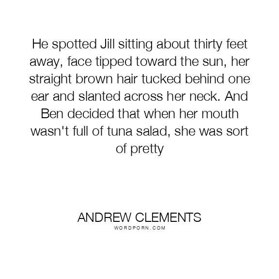 He spotted Jill sitting about thirty feet away, face tipped toward the sun, her straight brown hair tucked behind one ear and slanted across her neck. And Ben decided that when her mouth wasn't full of tuna salad, she was sort of pretty