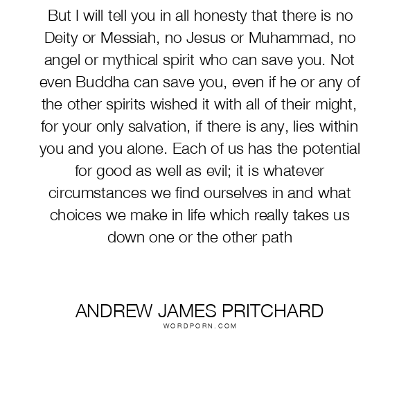 But I will tell you in all honesty that there is no Deity or Messiah, no Jesus or Muhammad, no angel or mythical spirit who can save you. Not even Buddha can save you, even if he or any of the other spirits wished it with all of their might, for your only salvation, if there is any, lies within you and you alone. Each of us has the potential for good as well as evil; it is whatever circumstances we find ourselves in and what choices we make in life which really takes us down one or the other path