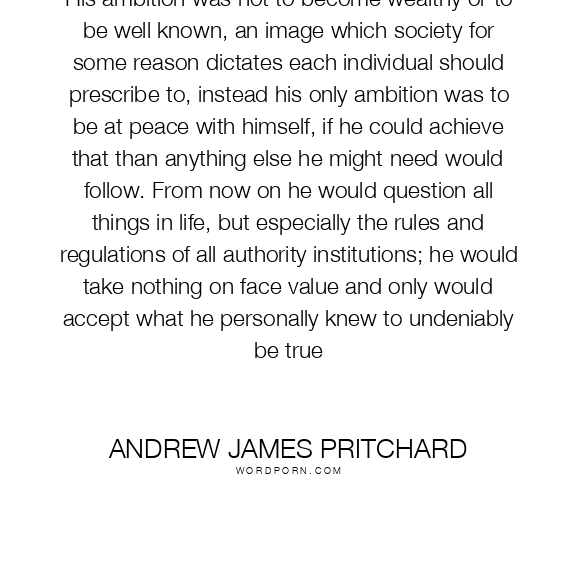 His ambition was not to become wealthy or to be well known, an image which society for some reason dictates each individual should prescribe to, instead his only ambition was to be at peace with himself, if he could achieve that than anything else he might need would follow. From now on he would question all things in life, but especially the rules and regulations of all authority institutions; he would take nothing on face value and only would accept what he personally knew to undeniably be true