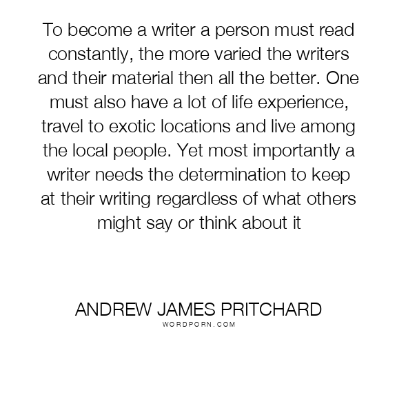 To become a writer a person must read constantly, the more varied the writers and their material then all the better. One must also have a lot of life experience, travel to exotic locations and live among the local people. Yet most importantly a writer needs the determination to keep at their writing regardless of what others might say or think about it