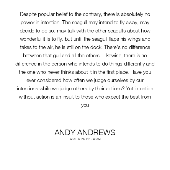 Despite popular belief to the contrary, there is absolutely no power in intention. The seagull may intend to fly away, may decide to do so, may talk with the other seagulls about how wonderful it is to fly, but until the seagull flaps his wings and takes to the air, he is still on the dock. There’s no difference between that gull and all the others. Likewise, there is no difference in the person who intends to do things differently and the one who never thinks about it in the first place. Have you ever considered how often we judge ourselves by our intentions while we judge others by their actions? Yet intention without action is an insult to those who expect the best from you