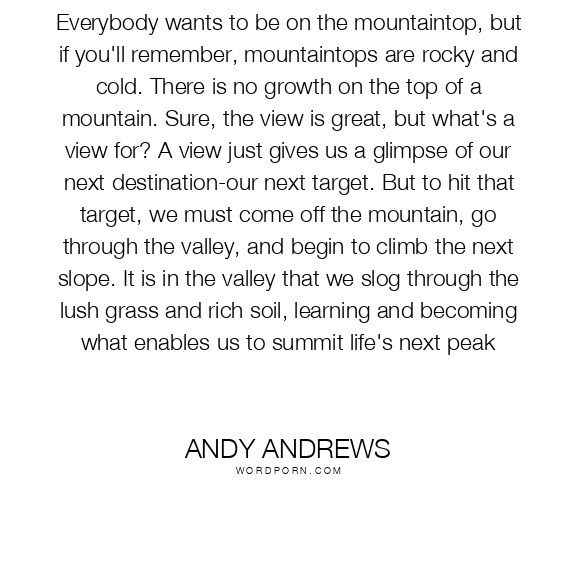 Everybody wants to be on the mountaintop, but if you'll remember, mountaintops are rocky and cold. There is no growth on the top of a mountain. Sure, the view is great, but what's a view for? A view just gives us a glimpse of our next destination-our next target. But to hit that target, we must come off the mountain, go through the valley, and begin to climb the next slope. It is in the valley that we slog through the lush grass and rich soil, learning and becoming what enables us to summit life's next peak