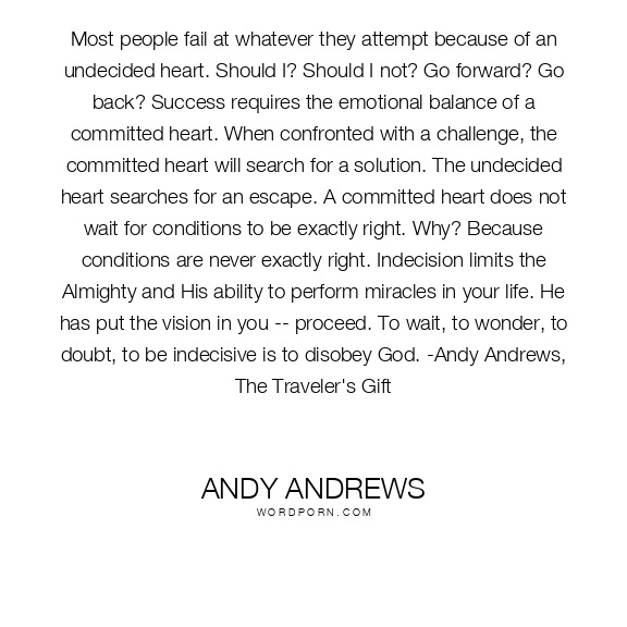 Most people fail at whatever they attempt because of an undecided heart. Should I? Should I not? Go forward? Go back? Success requires the emotional balance of a committed heart. When confronted with a challenge, the committed heart will search for a solution. The undecided heart searches for an escape. A committed heart does not wait for conditions to be exactly right. Why? Because conditions are never exactly right. Indecision limits the Almighty and His ability to perform miracles in your life. He has put the vision in you -- proceed. To wait, to wonder, to doubt, to be indecisive is to disobey God. -Andy Andrews, The Traveler's Gift