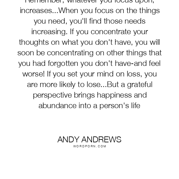 Remember, whatever you focus upon, increases...When you focus on the things you need, you'll find those needs increasing. If you concentrate your thoughts on what you don't have, you will soon be concentrating on other things that you had forgotten you don't have-and feel worse! If you set your mind on loss, you are more likely to lose...But a grateful perspective brings happiness and abundance into a person's life