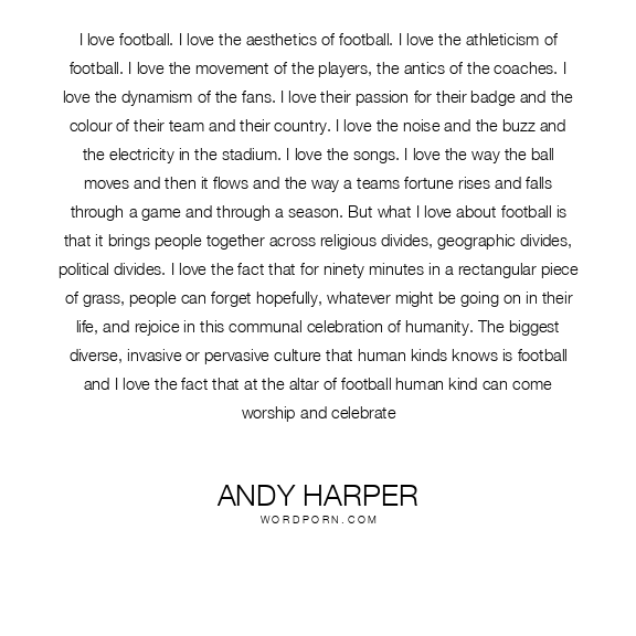 I love football. I love the aesthetics of football. I love the athleticism of football. I love the movement of the players, the antics of the coaches. I love the dynamism of the fans. I love their passion for their badge and the colour of their team and their country. I love the noise and the buzz and the electricity in the stadium. I love the songs. I love the way the ball moves and then it flows and the way a teams fortune rises and falls through a game and through a season. But what I love about football is that it brings people together across religious divides, geographic divides, political divides. I love the fact that for ninety minutes in a rectangular piece of grass, people can forget hopefully, whatever might be going on in their life, and rejoice in this communal celebration of humanity. The biggest diverse, invasive or pervasive culture that human kinds knows is football and I love the fact that at the altar of football human kind can come worship and celebrate