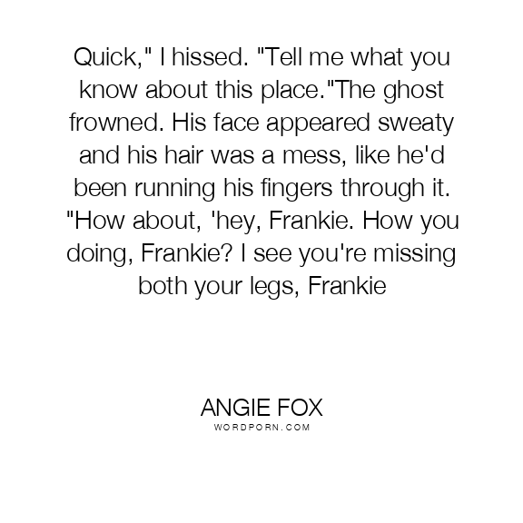 Quick," I hissed. "Tell me what you know about this place."The ghost frowned. His face appeared sweaty and his hair was a mess, like he'd been running his fingers through it. "How about, 'hey, Frankie. How you doing, Frankie? I see you're missing both your legs, Frankie