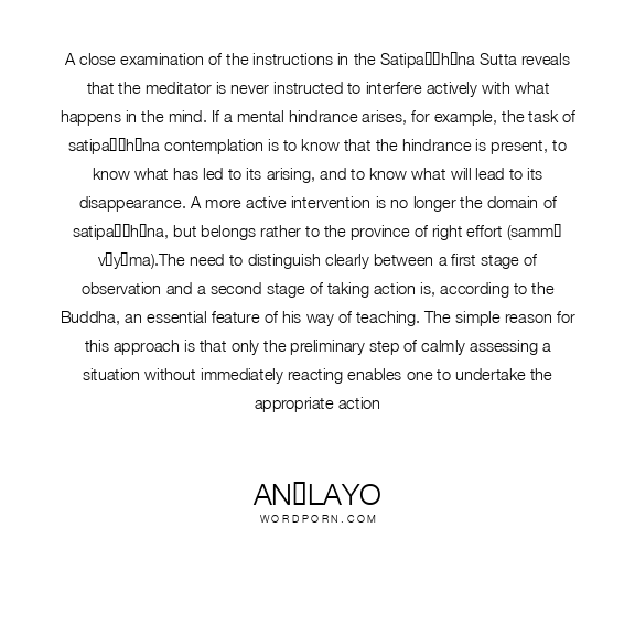 A close examination of the instructions in the Satipaṭṭhāna Sutta reveals that the meditator is never instructed to interfere actively with what happens in the mind. If a mental hindrance arises, for example, the task of satipaṭṭhāna contemplation is to know that the hindrance is present, to know what has led to its arising, and to know what will lead to its disappearance. A more active intervention is no longer the domain of satipaṭṭhāna, but belongs rather to the province of right effort (sammā vāyāma).The need to distinguish clearly between a first stage of observation and a second stage of taking action is, according to the Buddha, an essential feature of his way of teaching. The simple reason for this approach is that only the preliminary step of calmly assessing a situation without immediately reacting enables one to undertake the appropriate action
