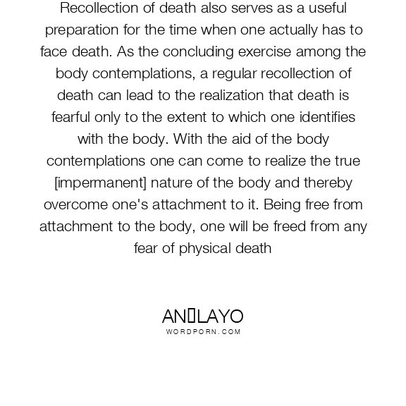 Recollection of death also serves as a useful preparation for the time when one actually has to face death. As the concluding exercise among the body contemplations, a regular recollection of death can lead to the realization that death is fearful only to the extent to which one identifies with the body. With the aid of the body contemplations one can come to realize the true [impermanent] nature of the body and thereby overcome one's attachment to it. Being free from attachment to the body, one will be freed from any fear of physical death