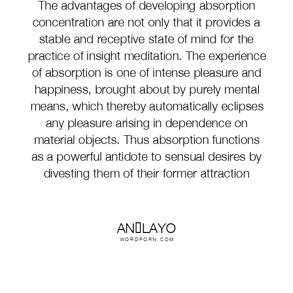 The advantages of developing absorption concentration are not only that it provides a stable and receptive state of mind for the practice of insight meditation. The experience of absorption is one of intense pleasure and happiness, brought about by purely mental means, which thereby automatically eclipses any pleasure arising in dependence on material objects. Thus absorption functions as a powerful antidote to sensual desires by divesting them of their former attraction