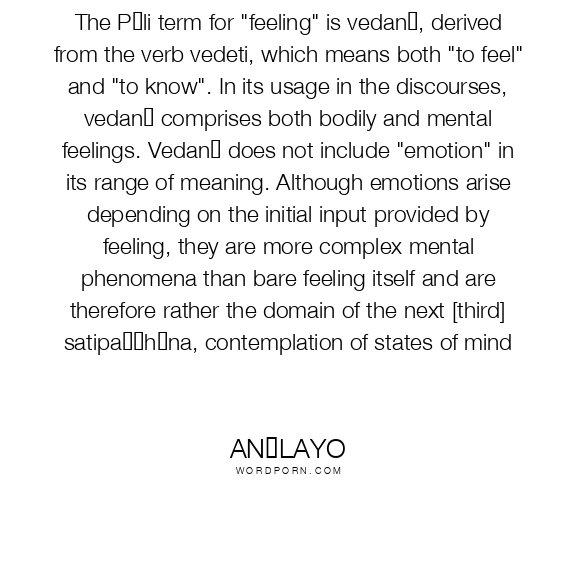 The Pāli term for "feeling" is vedanā, derived from the verb vedeti, which means both "to feel" and "to know". In its usage in the discourses, vedanā comprises both bodily and mental feelings. Vedanā does not include "emotion" in its range of meaning. Although emotions arise depending on the initial input provided by feeling, they are more complex mental phenomena than bare feeling itself and are therefore rather the domain of the next [third] satipaṭṭhāna, contemplation of states of mind