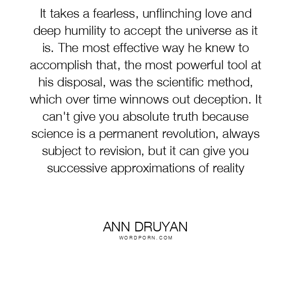 It takes a fearless, unflinching love and deep humility to accept the universe as it is. The most effective way he knew to accomplish that, the most powerful tool at his disposal, was the scientific method, which over time winnows out deception. It can't give you absolute truth because science is a permanent revolution, always subject to revision, but it can give you successive approximations of reality