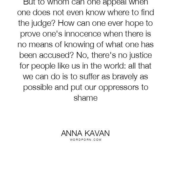 But to whom can one appeal when one does not even know where to find the judge? How can one ever hope to prove one's innocence when there is no means of knowing of what one has been accused? No, there's no justice for people like us in the world: all that we can do is to suffer as bravely as possible and put our oppressors to shame