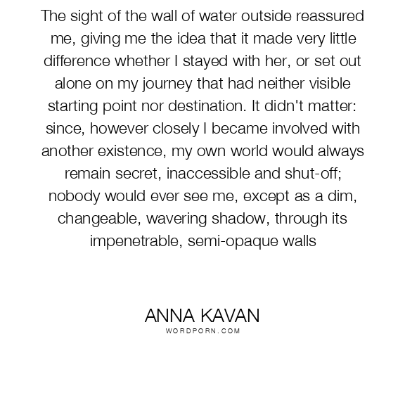 The sight of the wall of water outside reassured me, giving me the idea that it made very little difference whether I stayed with her, or set out alone on my journey that had neither visible starting point nor destination. It didn't matter: since, however closely I became involved with another existence, my own world would always remain secret, inaccessible and shut-off; nobody would ever see me, except as a dim, changeable, wavering shadow, through its impenetrable, semi-opaque walls