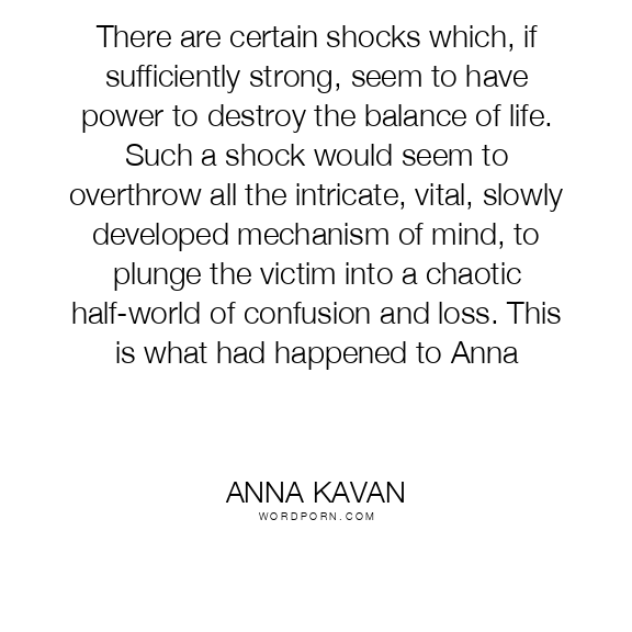 There are certain shocks which, if sufficiently strong, seem to have power to destroy the balance of life. Such a shock would seem to overthrow all the intricate, vital, slowly developed mechanism of mind, to plunge the victim into a chaotic half-world of confusion and loss. This is what had happened to Anna
