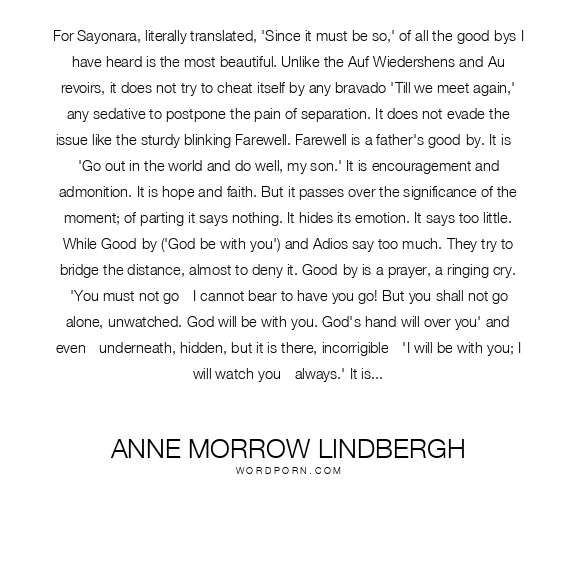 For Sayonara, literally translated, 'Since it must be so,' of all the good-bys I have heard is the most beautiful. Unlike the Auf Wiedershens and Au revoirs, it does not try to cheat itself by any bravado 'Till we meet again,' any sedative to postpone the pain of separation. It does not evade the issue like the sturdy blinking Farewell. Farewell is a father's good-by. It is - 'Go out in the world and do well, my son.' It is encouragement and admonition. It is hope and faith. But it passes over the significance of the moment; of parting it says nothing. It hides its emotion. It says too little. While Good-by ('God be with you') and Adios say too much. They try to bridge the distance, almost to deny it. Good-by is a prayer, a ringing cry. 'You must not go - I cannot bear to have you go! But you shall not go alone, unwatched. God will be with you. God's hand will over you' and even - underneath, hidden, but it is there, incorrigible - 'I will be with you; I will watch you - always.' It is a mother's good-by. But Sayonara says neither too much nor too little. It is a simple acceptance of fact. All understanding of life lies in its limits. All emotion, smoldering, is banked up behind it. But it says nothing. It is really the unspoken good-by, the pressure of a hand, 'Sayonara