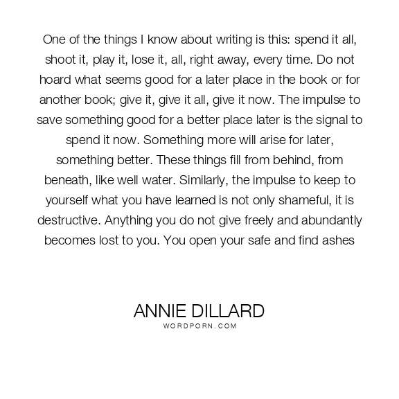 One of the things I know about writing is this: spend it all, shoot it, play it, lose it, all, right away, every time. Do not hoard what seems good for a later place in the book or for another book; give it, give it all, give it now. The impulse to save something good for a better place later is the signal to spend it now. Something more will arise for later, something better. These things fill from behind, from beneath, like well water. Similarly, the impulse to keep to yourself what you have learned is not only shameful, it is destructive. Anything you do not give freely and abundantly becomes lost to you. You open your safe and find ashes