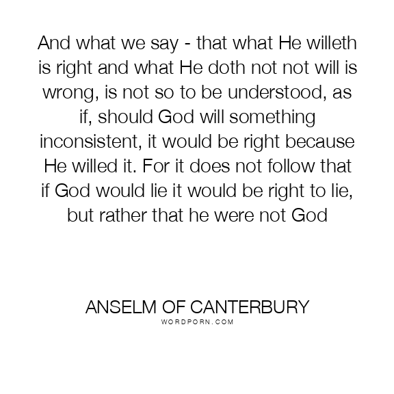 And what we say - that what He willeth is right and what He doth not not will is wrong, is not so to be understood, as if, should God will something inconsistent, it would be right because He willed it. For it does not follow that if God would lie it would be right to lie, but rather that he were not God