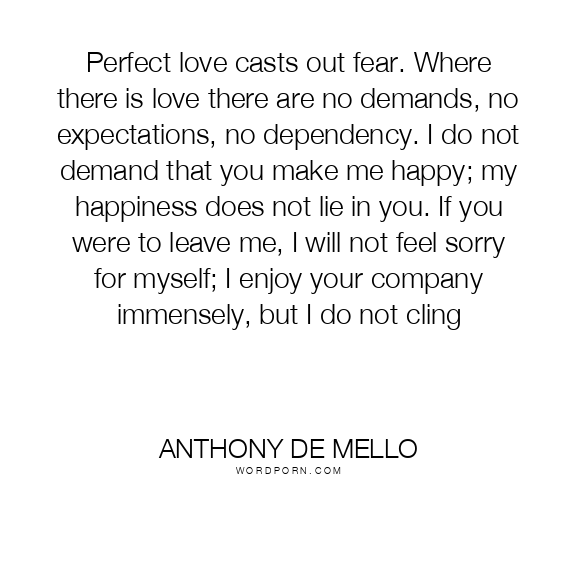 Perfect love casts out fear. Where there is love there are no demands, no expectations, no dependency. I do not demand that you make me happy; my happiness does not lie in you. If you were to leave me, I will not feel sorry for myself; I enjoy your company immensely, but I do not cling