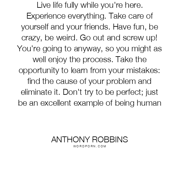 Live life fully while you're here. Experience everything. Take care of yourself and your friends. Have fun, be crazy, be weird. Go out and screw up! You're going to anyway, so you might as well enjoy the process. Take the opportunity to learn from your mistakes: find the cause of your problem and eliminate it. Don't try to be perfect; just be an excellent example of being human