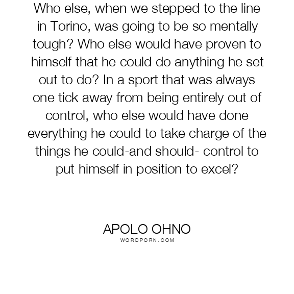 Who else, when we stepped to the line in Torino, was going to be so mentally tough? Who else would have proven to himself that he could do anything he set out to do? In a sport that was always one tick away from being entirely out of control, who else would have done everything he could to take charge of the things he could-and should- control to put himself in position to excel?