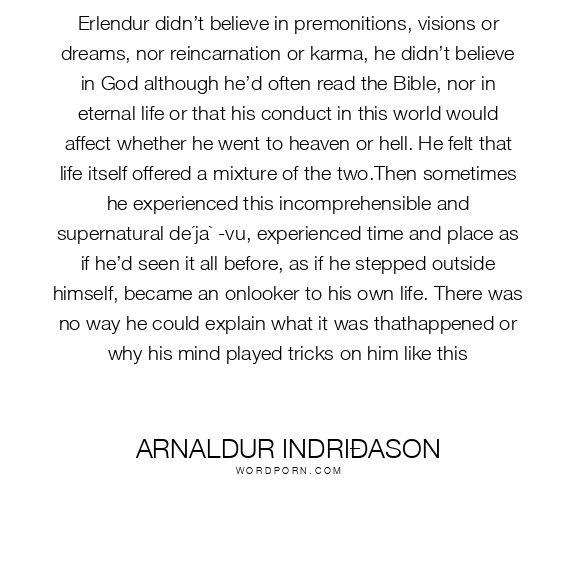 Erlendur didn’t believe in premonitions, visions or dreams, nor reincarnation or karma, he didn’t believe in God although he’d often read the Bible, nor in eternal life or that his conduct in this world would affect whether he went to heaven or hell. He felt that life itself offered a mixture of the two.Then sometimes he experienced this incomprehensible and supernatural de´ja` -vu, experienced time and place as if he’d seen it all before, as if he stepped outside himself, became an onlooker to his own life. There was no way he could explain what it was thathappened or why his mind played tricks on him like this