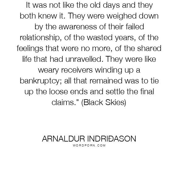 It was not like the old days and they both knew it. They were weighed down by the awareness of their failed relationship, of the wasted years, of the feelings that were no more, of the shared life that had unravelled. They were like weary receivers winding up a bankruptcy; all that remained was to tie up the loose ends and settle the final claims." (Black Skies)