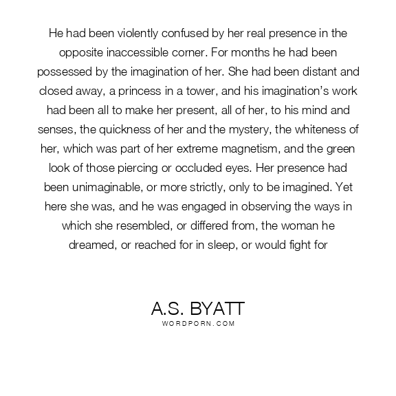 He had been violently confused by her real presence in the opposite inaccessible corner. For months he had been possessed by the imagination of her. She had been distant and closed away, a princess in a tower, and his imagination’s work had been all to make her present, all of her, to his mind and senses, the quickness of her and the mystery, the whiteness of her, which was part of her extreme magnetism, and the green look of those piercing or occluded eyes. Her presence had been unimaginable, or more strictly, only to be imagined. Yet here she was, and he was engaged in observing the ways in which she resembled, or differed from, the woman he dreamed, or reached for in sleep, or would fight for
