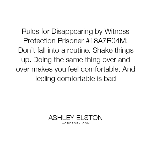 Rules for Disappearing by Witness Protection Prisoner #18A7R04M: Don’t fall into a routine. Shake things up. Doing the same thing over and over makes you feel comfortable. And feeling comfortable is bad