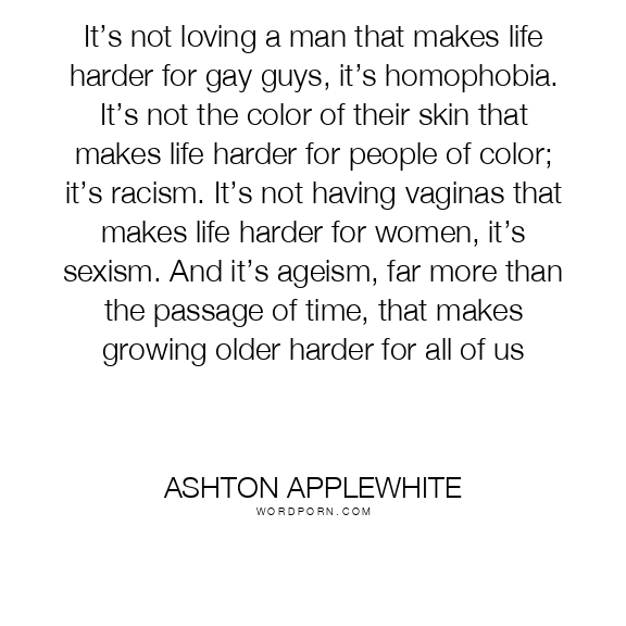 It’s not loving a man that makes life harder for gay guys, it’s homophobia. It’s not the color of their skin that makes life harder for people of color; it’s racism. It’s not having vaginas that makes life harder for women, it’s sexism. And it’s ageism, far more than the passage of time, that makes growing older harder for all of us