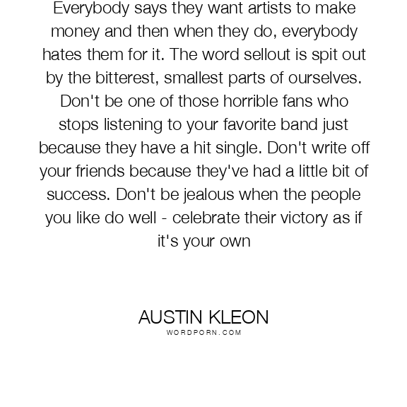Everybody says they want artists to make money and then when they do, everybody hates them for it. The word sellout is spit out by the bitterest, smallest parts of ourselves. Don't be one of those horrible fans who stops listening to your favorite band just because they have a hit single. Don't write off your friends because they've had a little bit of success. Don't be jealous when the people you like do well - celebrate their victory as if it's your own