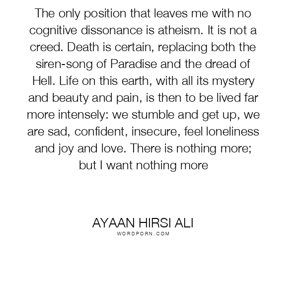 The only position that leaves me with no cognitive dissonance is atheism. It is not a creed. Death is certain, replacing both the siren-song of Paradise and the dread of Hell. Life on this earth, with all its mystery and beauty and pain, is then to be lived far more intensely: we stumble and get up, we are sad, confident, insecure, feel loneliness and joy and love. There is nothing more; but I want nothing more