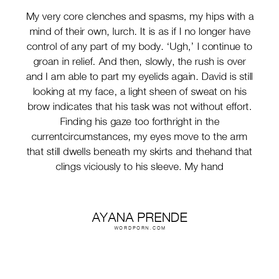 My very core clenches and spasms, my hips with a mind of their own, lurch. It is as if I no longer have control of any part of my body. ‘Ugh,’ I continue to groan in relief. And then, slowly, the rush is over and I am able to part my eyelids again. David is still looking at my face, a light sheen of sweat on his brow indicates that his task was not without effort. Finding his gaze too forthright in the currentcircumstances, my eyes move to the arm that still dwells beneath my skirts and thehand that clings viciously to his sleeve. My hand