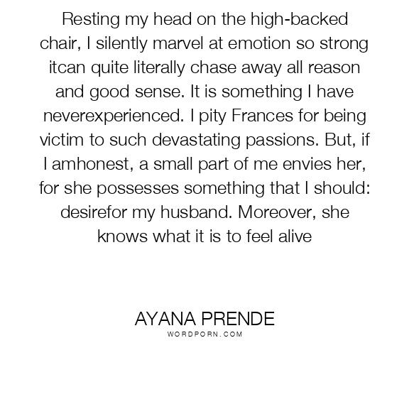 Resting my head on the high-backed chair, I silently marvel at emotion so strong itcan quite literally chase away all reason and good sense. It is something I have neverexperienced. I pity Frances for being victim to such devastating passions. But, if I amhonest, a small part of me envies her, for she possesses something that I should: desirefor my husband. Moreover, she knows what it is to feel alive