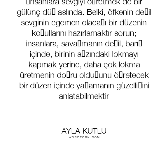 İnsanlara sevgiyi öğretmek de bir gülünç düş aslında. Belki, öfkenin değil sevginin egemen olacağı bir düzenin koşullarını hazırlamaktır sorun; insanlara, savaşmanın değil, barış içinde, birinin ağzındaki lokmayı kapmak yerine, daha çok lokma üretmenin doğru olduğunu öğretecek bir düzen içinde yaşamanın güzelliğini anlatabilmektir