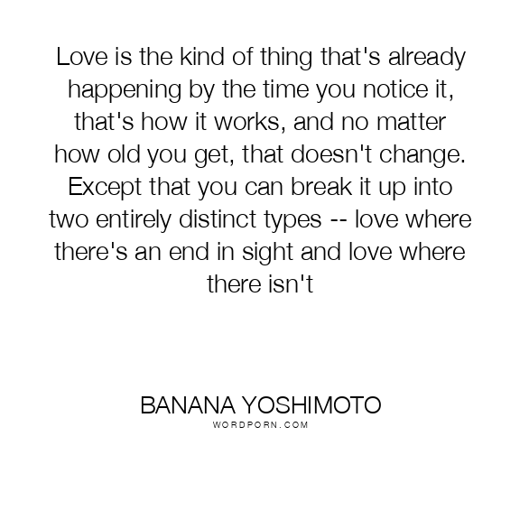 Love is the kind of thing that's already happening by the time you notice it, that's how it works, and no matter how old you get, that doesn't change. Except that you can break it up into two entirely distinct types -- love where there's an end in sight and love where there isn't
