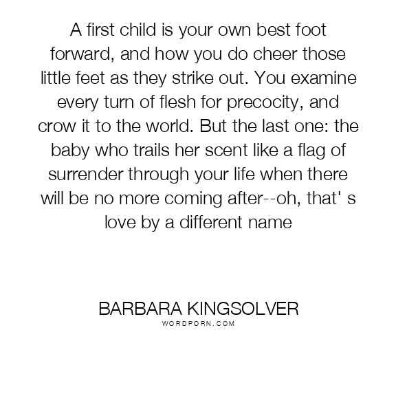 A first child is your own best foot forward, and how you do cheer those little feet as they strike out. You examine every turn of flesh for precocity, and crow it to the world. But the last one: the baby who trails her scent like a flag of surrender through your life when there will be no more coming after--oh, that' s love by a different name