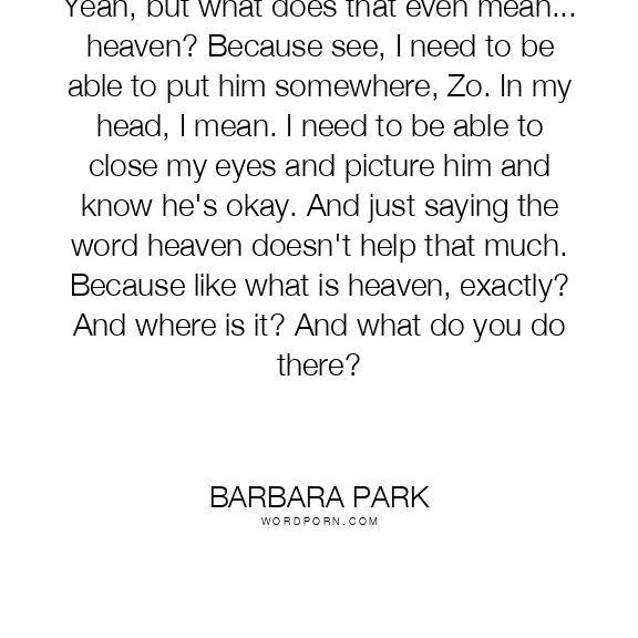 Yeah, but what does that even mean... heaven? Because see, I need to be able to put him somewhere, Zo. In my head, I mean. I need to be able to close my eyes and picture him and know he's okay. And just saying the word heaven doesn't help that much. Because like what is heaven, exactly? And where is it? And what do you do there?