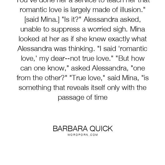 You've done her a service to teach her that romantic love is largely made of illusion." [said Mina.] "Is it?" Alessandra asked, unable to suppress a worried sigh. Mina looked at her as if she knew exactly what Alessandra was thinking. "I said 'romantic love,' my dear--not true love." "But how can one know," asked Alessandra, "one from the other?" "True love," said Mina, "is something that reveals itself only with the passage of time