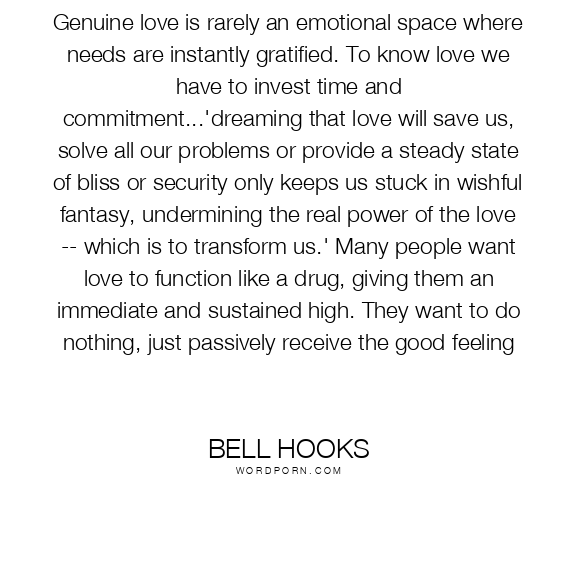 Genuine love is rarely an emotional space where needs are instantly gratified. To know love we have to invest time and commitment...'dreaming that love will save us, solve all our problems or provide a steady state of bliss or security only keeps us stuck in wishful fantasy, undermining the real power of the love -- which is to transform us.' Many people want love to function like a drug, giving them an immediate and sustained high. They want to do nothing, just passively receive the good feeling