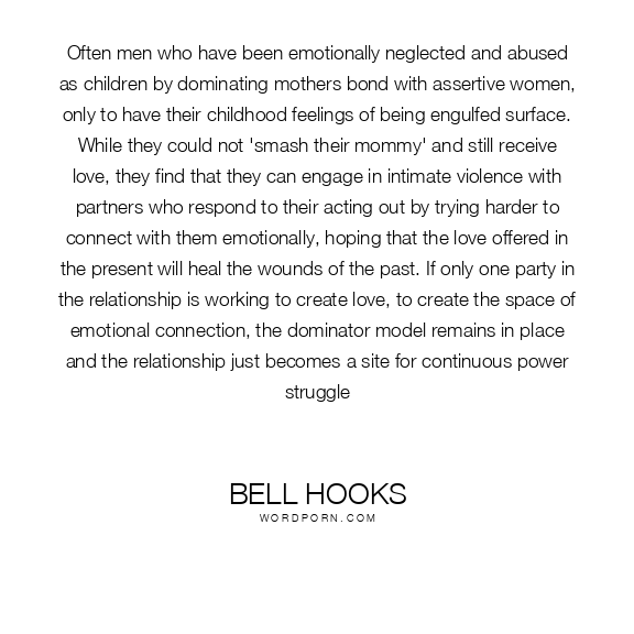 Often men who have been emotionally neglected and abused as children by dominating mothers bond with assertive women, only to have their childhood feelings of being engulfed surface. While they could not 'smash their mommy' and still receive love, they find that they can engage in intimate violence with partners who respond to their acting out by trying harder to connect with them emotionally, hoping that the love offered in the present will heal the wounds of the past. If only one party in the relationship is working to create love, to create the space of emotional connection, the dominator model remains in place and the relationship just becomes a site for continuous power struggle