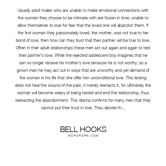 Usually adult males who are unable to make emotional connections with the women they choose to be intimate with are frozen in time, unable to allow themselves to love for fear that the loved one will abandon them. If the first woman they passionately loved, the mother, was not true to her bond of love, then how can they trust that their partner will be true to love. Often in their adult relationships these men act out again and again to test their partner's love. While the rejected adolescent boy imagines that he can no longer receive his mother's love because he is not worthy, as a grown man he may act out in ways that are unworthy and yet demand of the woman in his life that she offer him unconditional love. This testing does not heal the wound of the past, it merely reenacts it, for ultimately the woman will become weary of being tested and end the relationship, thus reenacting the abandonment. This drama confirms for many men that they cannot put their trust in love. They decide that it is better to put their faith in being powerful, in being dominant