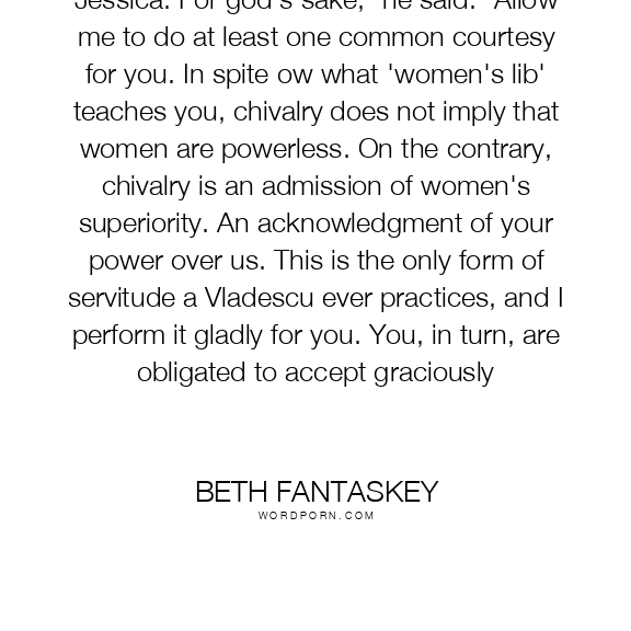 Jessica. For god's sake," he said. "Allow me to do at least one common courtesy for you. In spite ow what 'women's lib' teaches you, chivalry does not imply that women are powerless. On the contrary, chivalry is an admission of women's superiority. An acknowledgment of your power over us. This is the only form of servitude a Vladescu ever practices, and I perform it gladly for you. You, in turn, are obligated to accept graciously