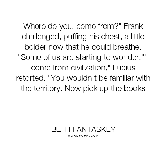 Where do you. come from?" Frank challenged, puffing his chest, a little bolder now that he could breathe. "Some of us are starting to wonder.""I come from civilization," Lucius retorted. "You wouldn't be familiar with the territory. Now pick up the books