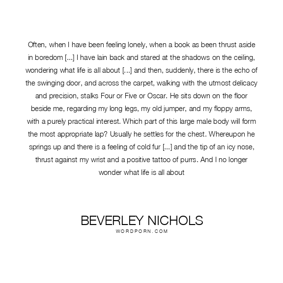 Often, when I have been feeling lonely, when a book as been thrust aside in boredom [...] I have lain back and stared at the shadows on the ceiling, wondering what life is all about [...] and then, suddenly, there is the echo of the swinging door, and across the carpet, walking with the utmost delicacy and precision, stalks Four or Five or Oscar. He sits down on the floor beside me, regarding my long legs, my old jumper, and my floppy arms, with a purely practical interest. Which part of this large male body will form the most appropriate lap? Usually he settles for the chest. Whereupon he springs up and there is a feeling of cold fur [...] and the tip of an icy nose, thrust against my wrist and a positive tattoo of purrs. And I no longer wonder what life is all about
