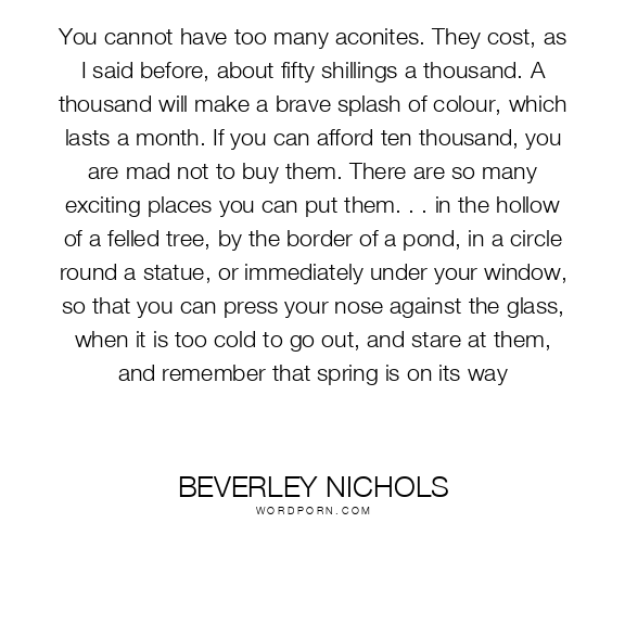 You cannot have too many aconites. They cost, as I said before, about fifty shillings a thousand. A thousand will make a brave splash of colour, which lasts a month. If you can afford ten thousand, you are mad not to buy them. There are so many exciting places you can put them. . . in the hollow of a felled tree, by the border of a pond, in a circle round a statue, or immediately under your window, so that you can press your nose against the glass, when it is too cold to go out, and stare at them, and remember that spring is on its way