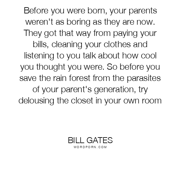 Before you were born, your parents weren't as boring as they are now. They got that way from paying your bills, cleaning your clothes and listening to you talk about how cool you thought you were. So before you save the rain forest from the parasites of your parent's generation, try delousing the closet in your own room