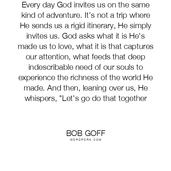 Every day God invites us on the same kind of adventure. It's not a trip where He sends us a rigid itinerary, He simply invites us. God asks what it is He's made us to love, what it is that captures our attention, what feeds that deep indescribable need of our souls to experience the richness of the world He made. And then, leaning over us, He whispers, "Let's go do that together